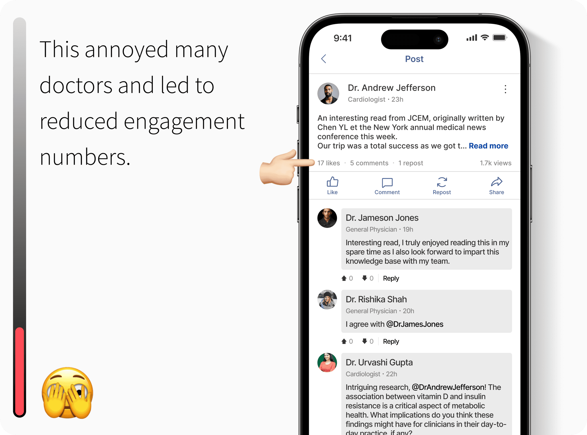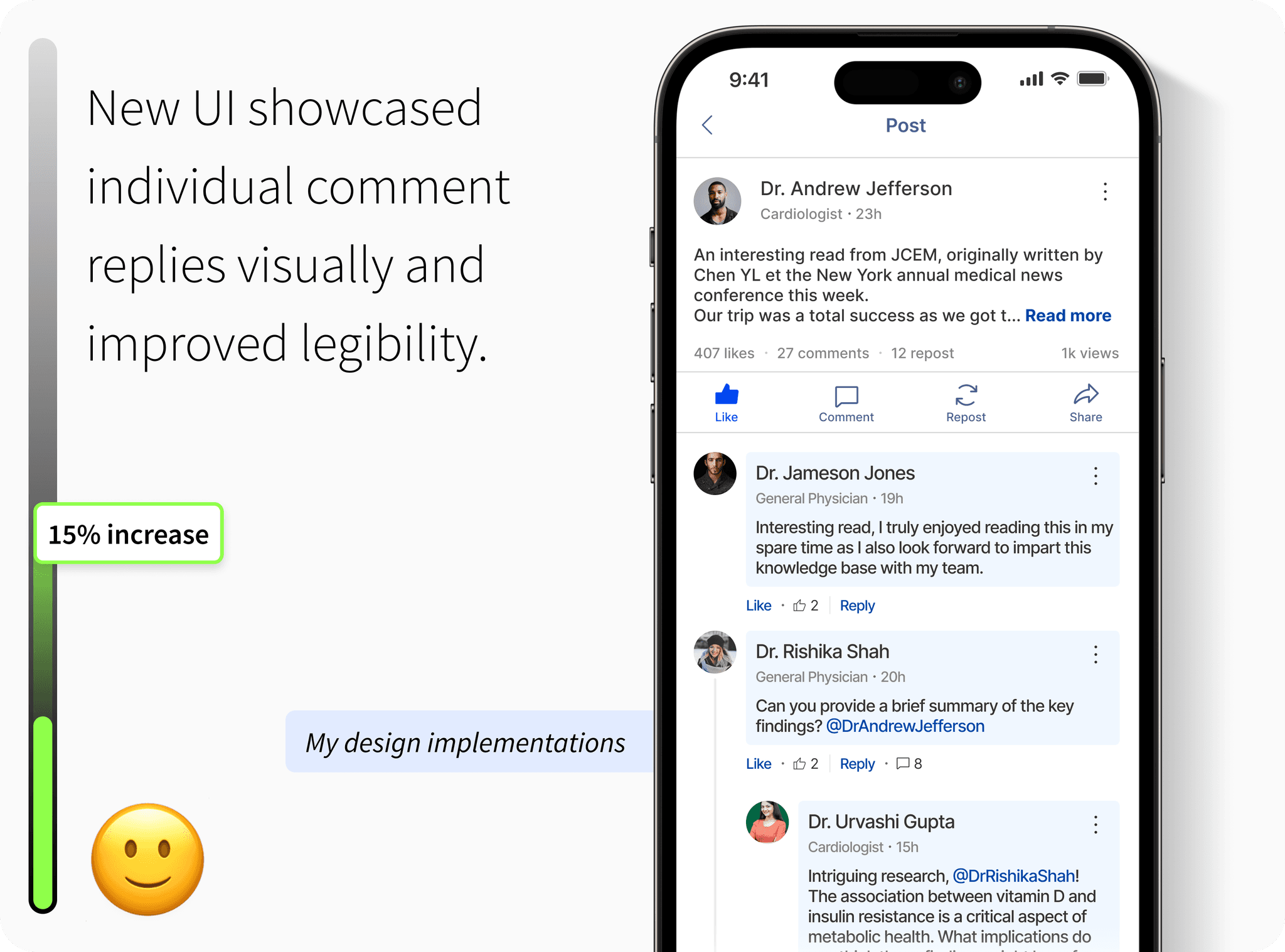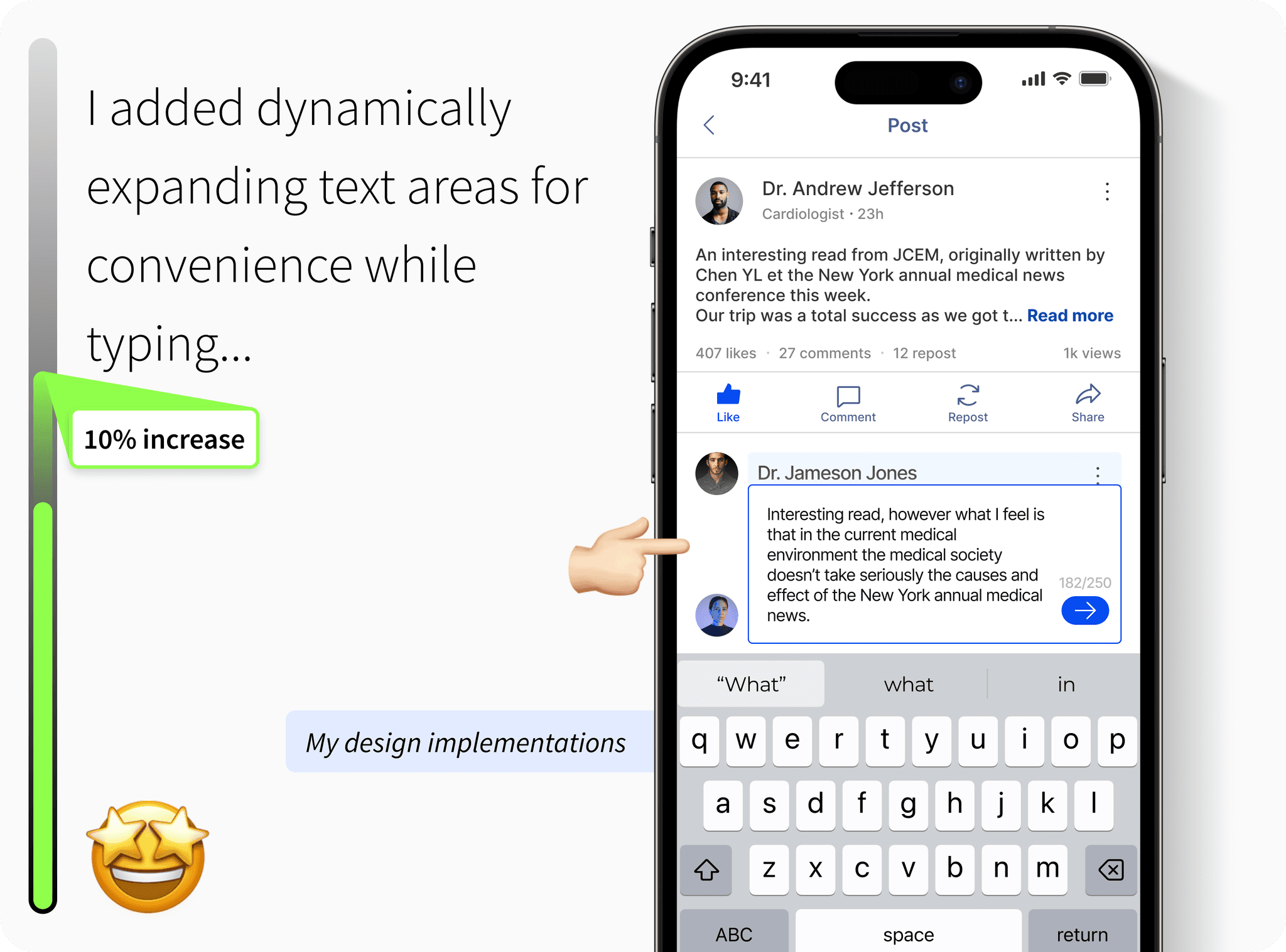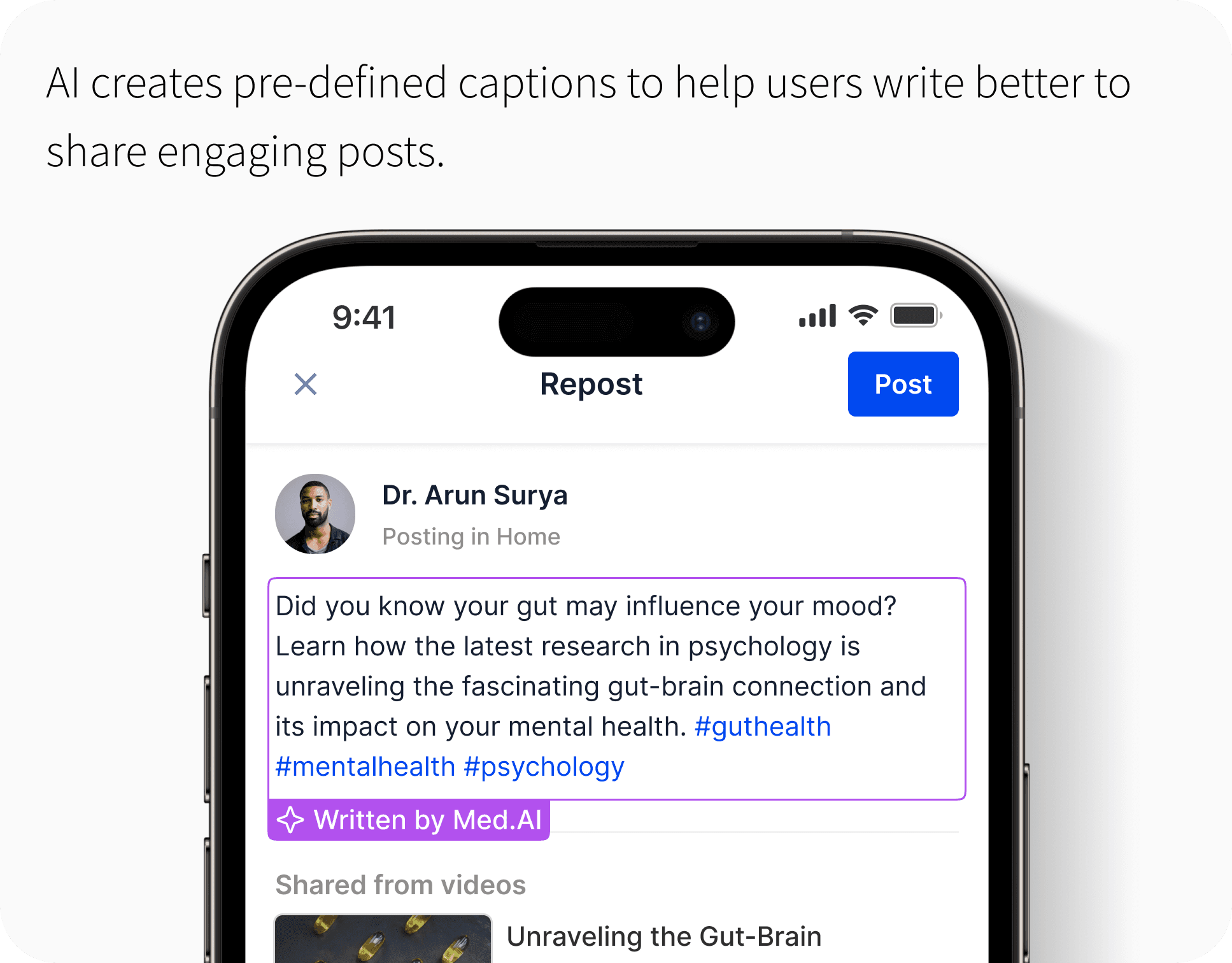 The stakeholder emphasized that the AI-assisted post creation feature should reduce friction, helping users express medical insights quickly while retaining authenticity. The goal was to encourage more professionals to share content consistently by simplifying the writing process, not automating it.