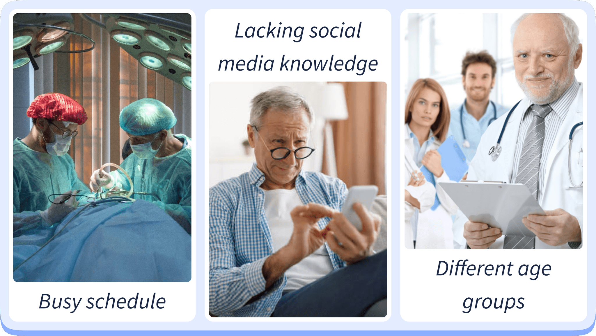 Busy schedules limit most doctors' engagement with social networking apps, causing them to miss out on valuable updates, resources, and peer connections. This hinders their professional growth and networking.