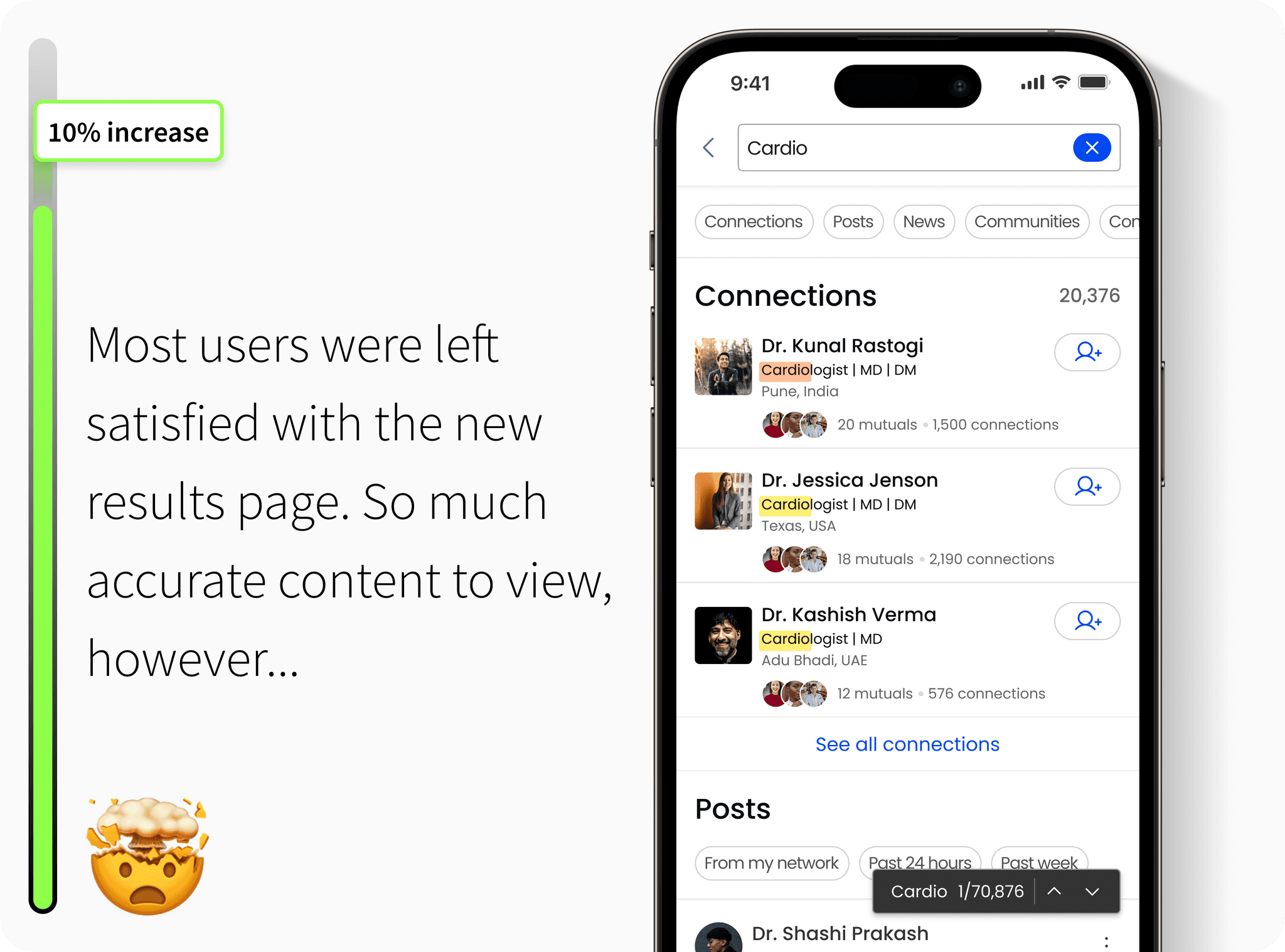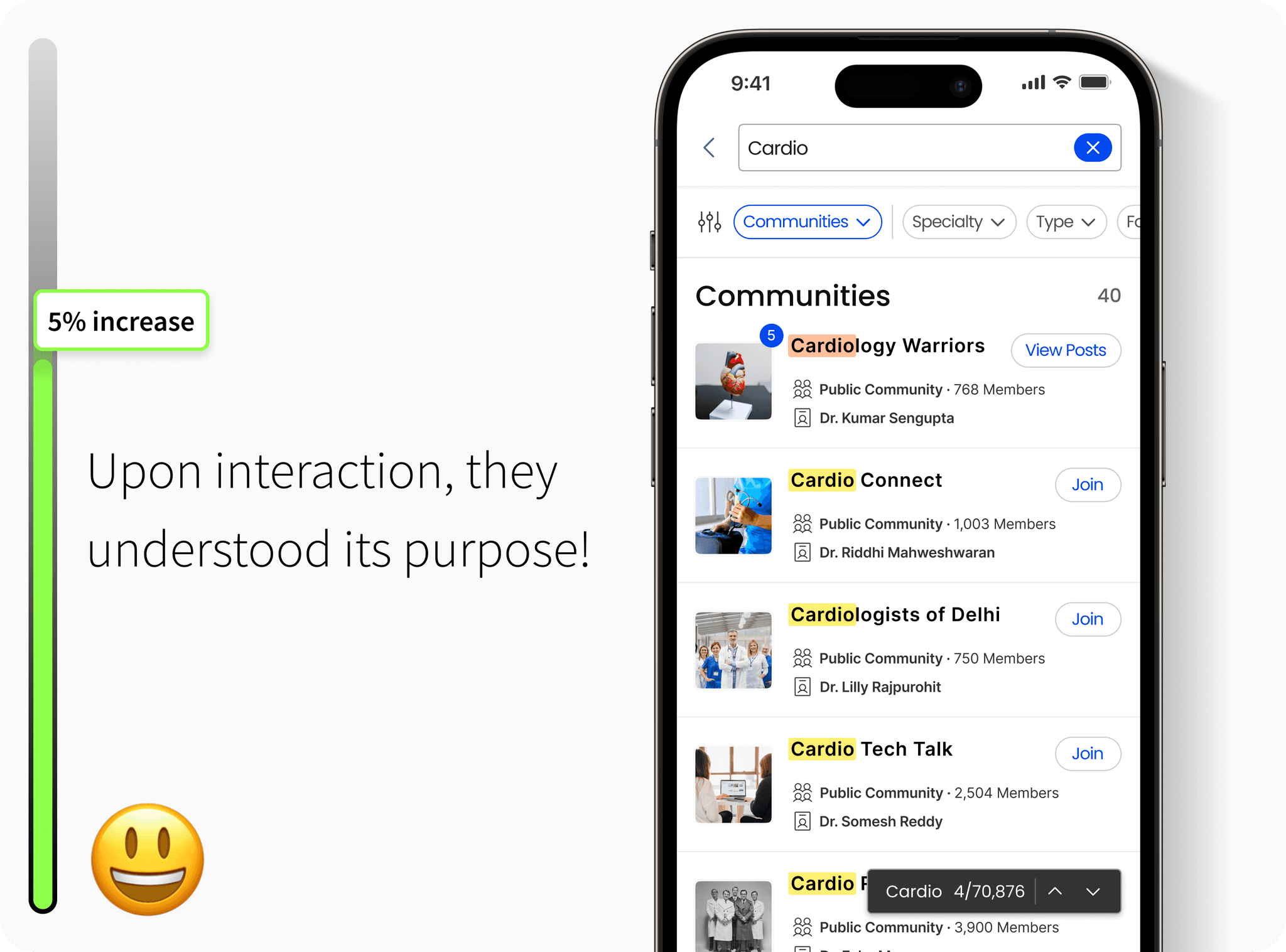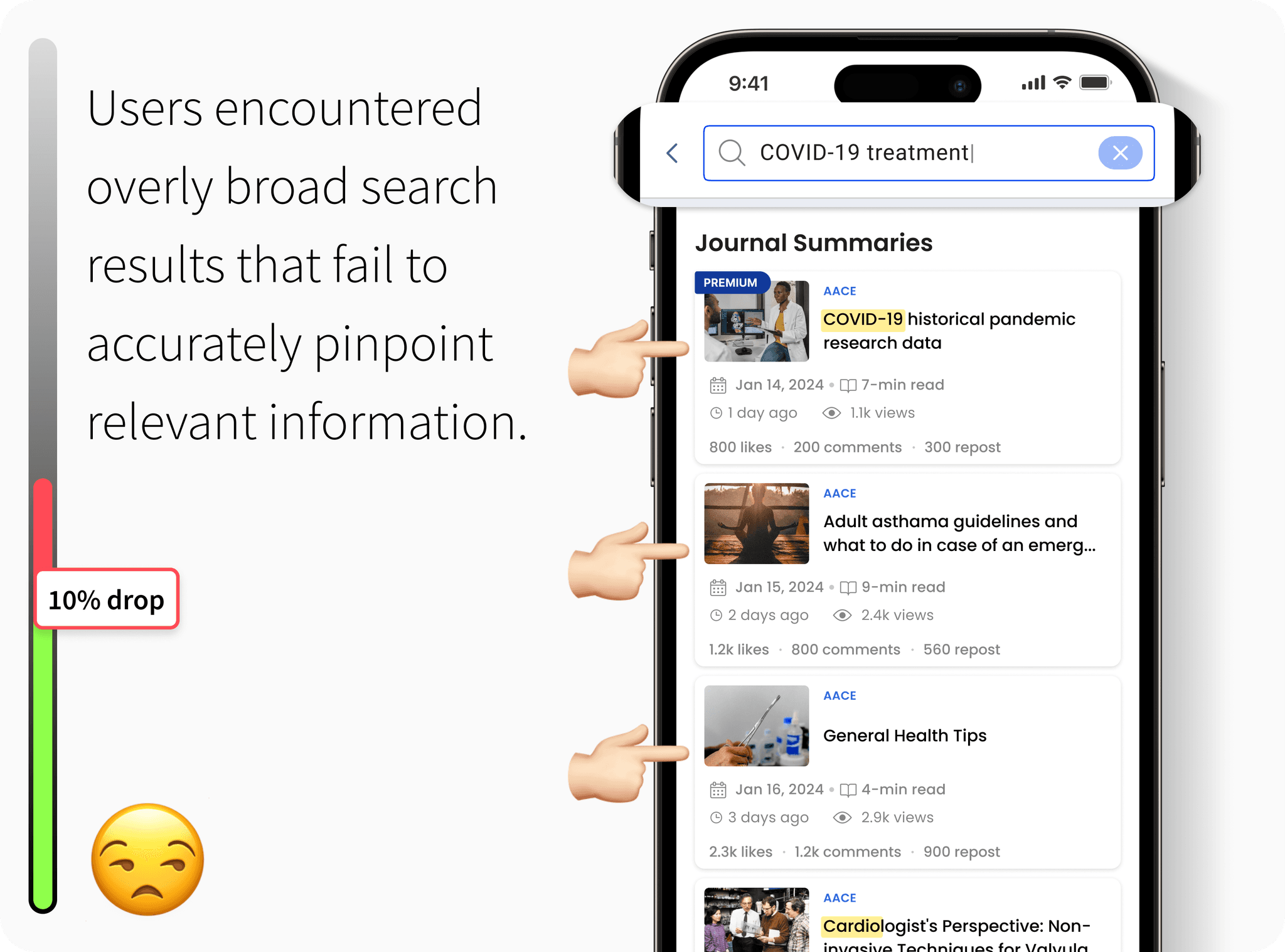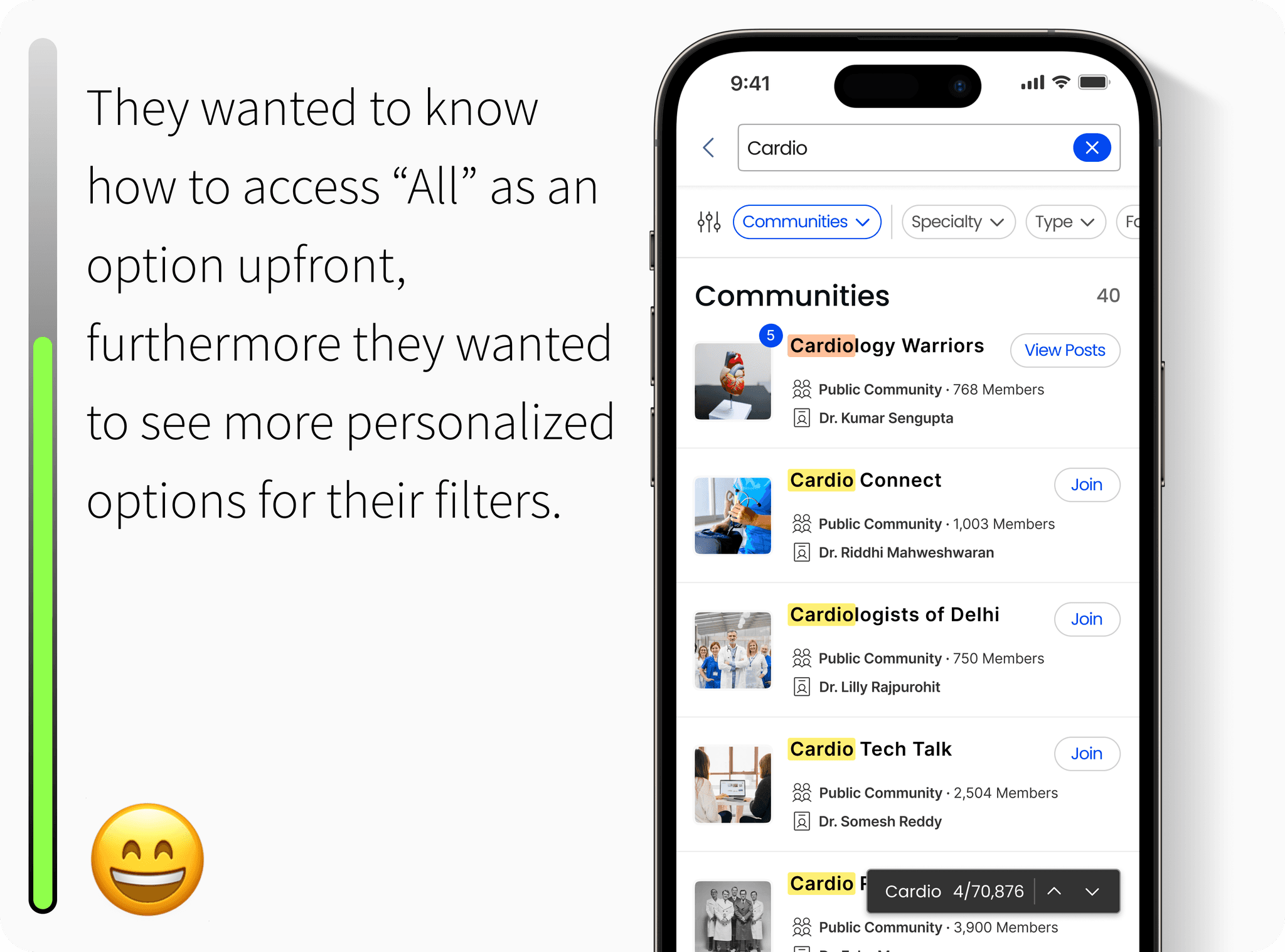 Doctors wanted more granular search filters, like specialty, location, and publication date, along with intelligent suggestions based on past queries.
