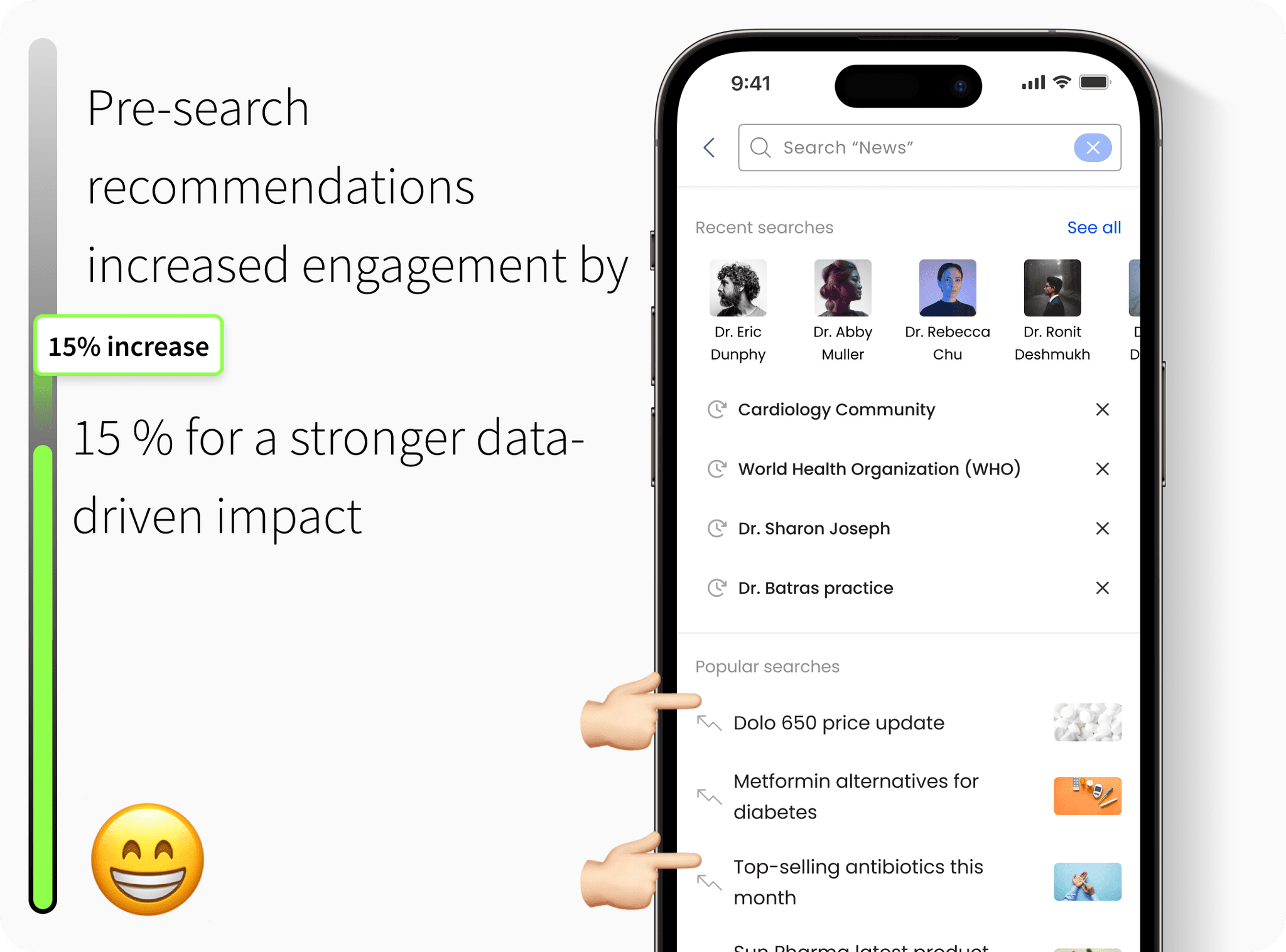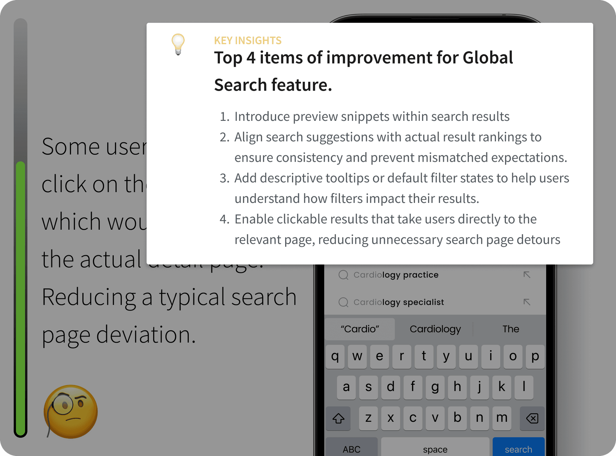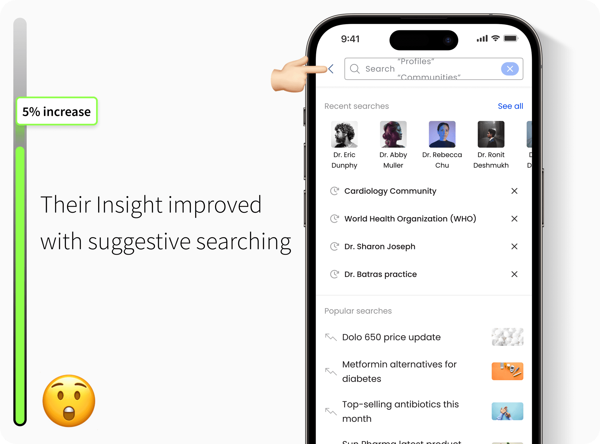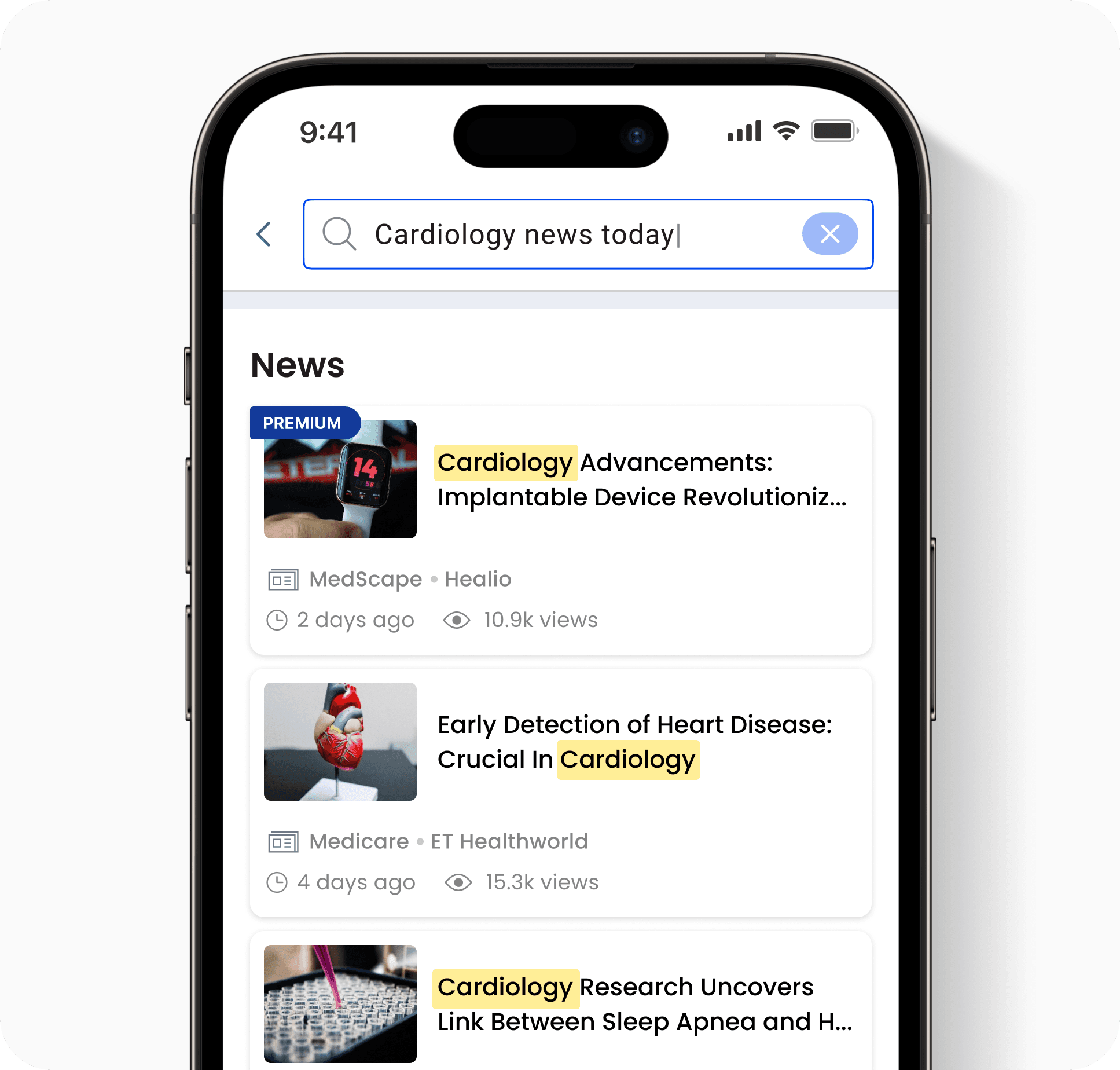 Doctors wanted more granular search filters, like specialty, location, and publication date, along with intelligent suggestions based on past queries.