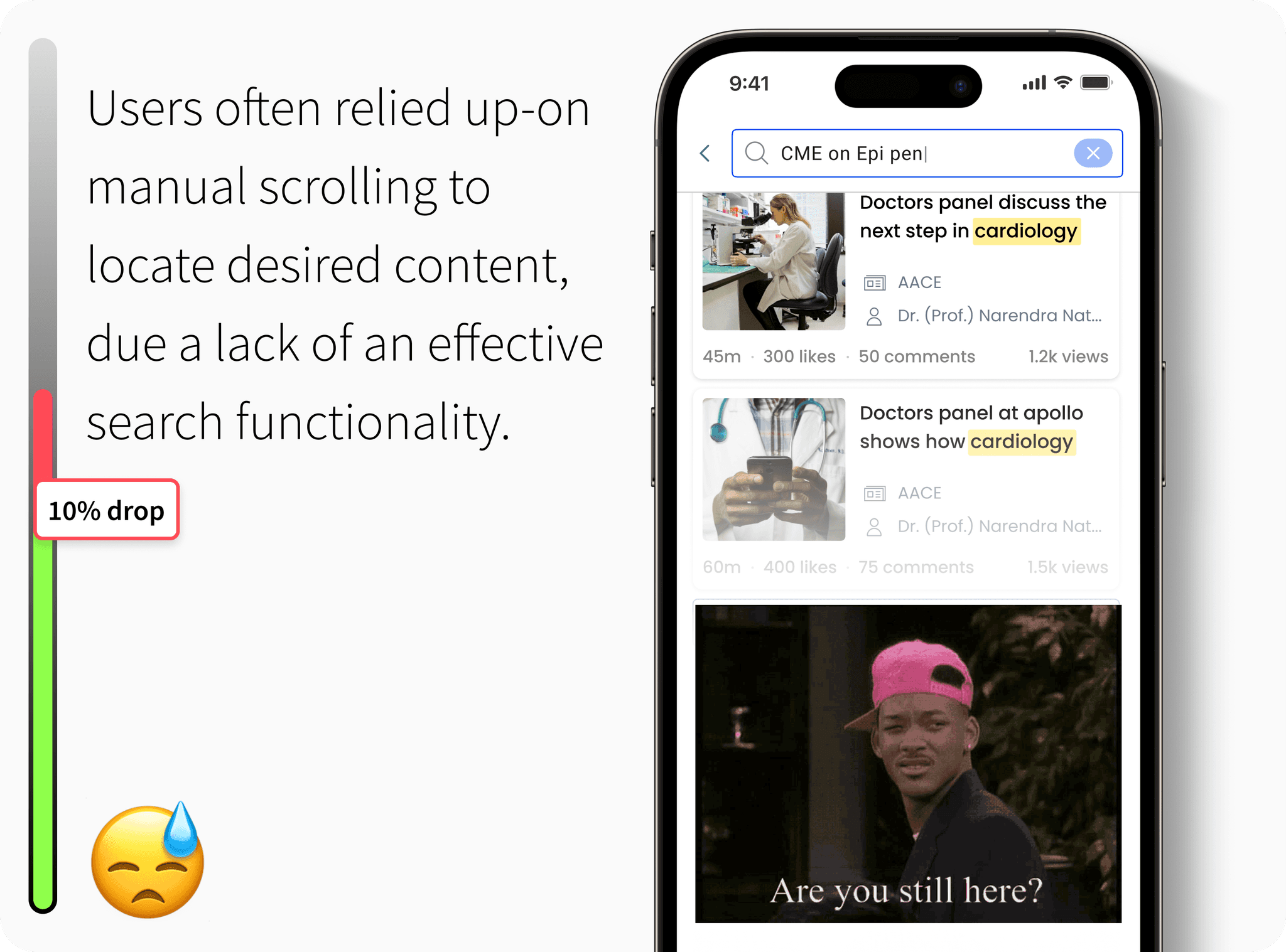 During the usability testing at the medical conference, I identified more pain points and workarounds in the current search functionality.