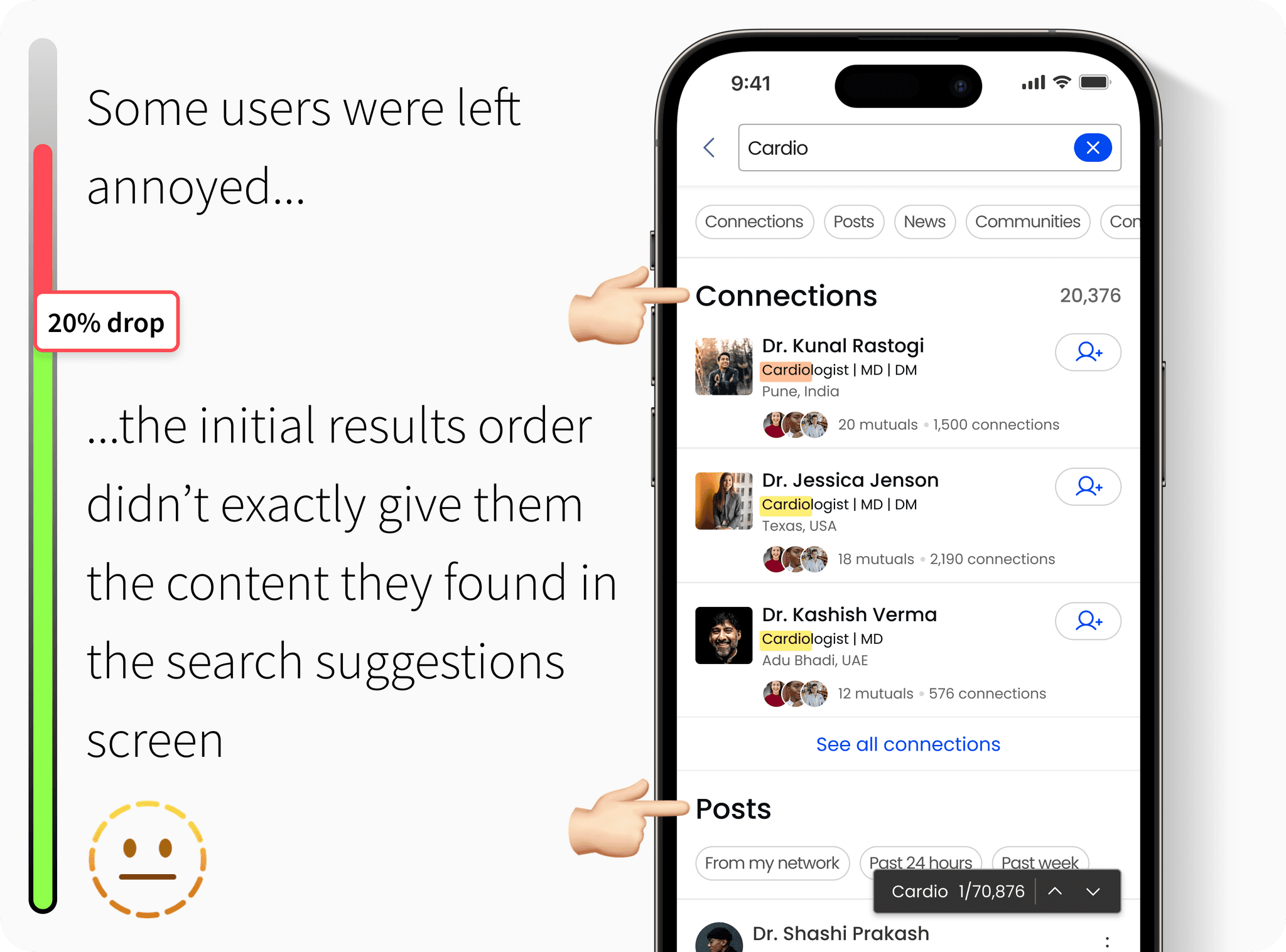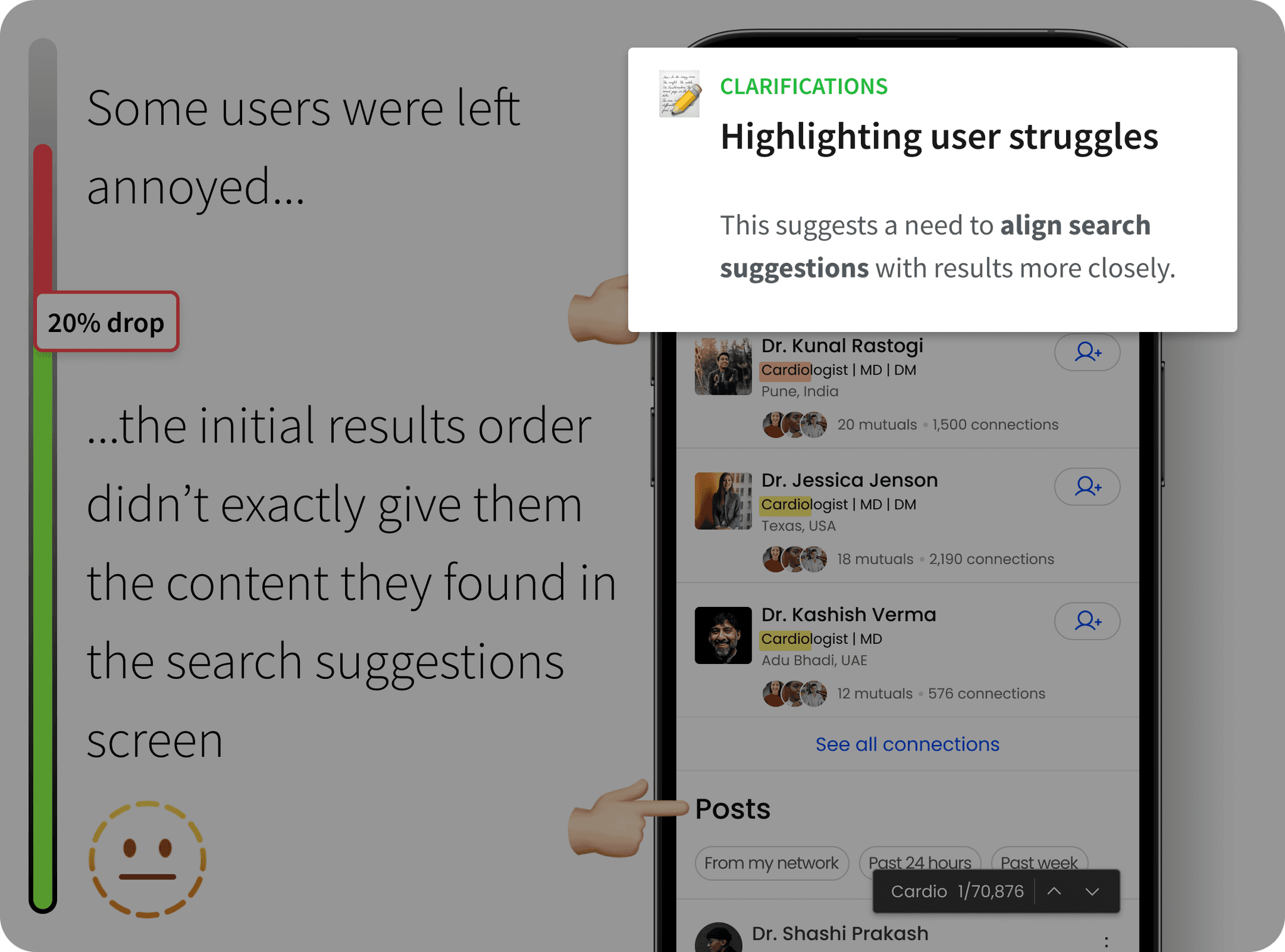 Applied data-driven decision-making, ensuring that insights (e.g., 20% drop-off due to mismatched results) led to measurable UX improvements.