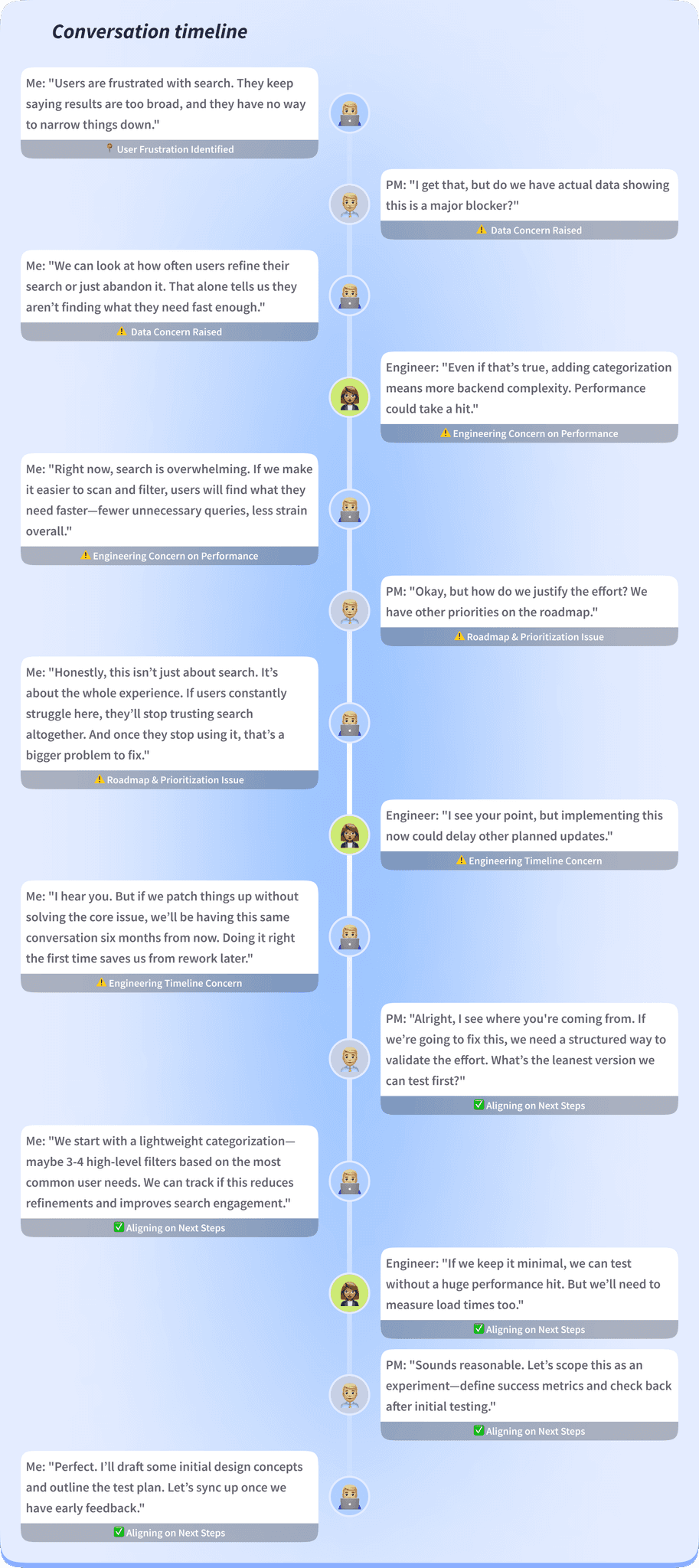 To move forward, we had to balance user needs with technical constraints and business priorities. This timeline captures the discussions, challenges, and eventual alignment that led us to a testable first step.